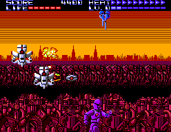 Voilà ce que l’ont pourrait qualifier d’ « Opération Wolf » futuriste, du tir sur cible au déroulement automatique, purement arcade, qui ne mettra pas vos neurones à rude épreuve. Développé par Sanritsu/Sims pour le compte de SEGA, ce jeu existe en deux versions, l’une tire partie du Light Phaser pour vous offrir du vrai gun shooting, l’autre, strictement identique dans sa forme et son déroulement, se joue plus classiquement au pad. Dans ce dernier cas, le premier bouton vous sert à faire feu, le second module la vitesse du curseur de tir.