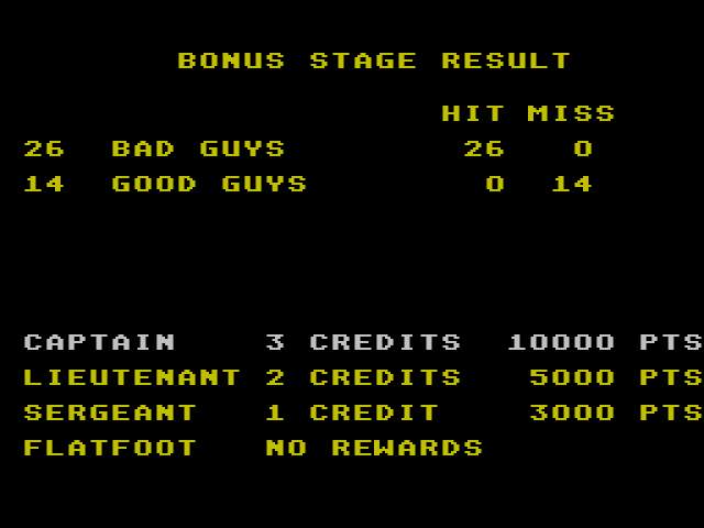 A la fin de chaque niveau, vous aurez droit à un niveau bonus qui consiste en un stand de tir. Le stand montrera successivement des séries de deux cibles représentant un gentil ou un méchant. Vous devrez tirer sur les méchants et vous retenir pour les autres. Dans ces phase,s le bouton 1 sert à tirer sur la cible de gauche, le 2 sur la cible de droite. C'est à peut près le seul moment où la maniabilité est correcte.