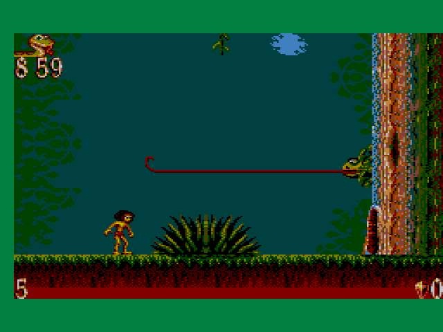Le premier niveau vous demande de trouver 8 gemmes. Bon ok. Mais il n'y en a que 8 dans le niveau donc il ne faut pas en louper une seule. Pour se faire, vous devrez souvent vous hisser à des lianes ou sauter sur des serpents ressorts. Le problème est que l'on se rend compte que Mowgli ne saute jamais assez loin pour atteindre des plateformes que l'on sent accessibles ! Il faut donc se faire suer à trouver un chemin ultra-précis pour atteindre l'endroit désiré. C'est casse-burne au possible !