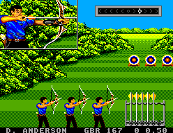 Dans la grande tradition du genre, les quatre premières épreuves sollicitent principalement l’aptitude du joueur à actionner frénétiquement les boutons du pad pour exploser les chronos ou grignoter de précieux mètres. Malgré quelques variantes, le gameplay est donc assez basique. Heureusement, le tir à l’arc et le plongeon apportent une variété salvatrice dans la mesure où c’est votre adresse et votre coordination qui comptent. Ces deux épreuves sont de loin les plus intéressantes, avec une marge de progression importante, elles justifient à elles seules l’achat de la cartouche.