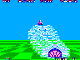 Grosse satisfaction, la représentation en pseudo 3-D a été conservée. Le scrolling a été fortement simplifié, il n’y a plus d’évolution de perspective, les décors de fond sont passés à la trappe, mais les ennemis sont absolument énormes, surtout les boss, occupant comme en arcade la quasi-totalité de l’écran en vue rapprochée ! Le code du jeu révèle à ce titre qu’une telle prouesse a été possible par l’utilisation d’une astuce de programmation bien trouvée : seul votre héros est un sprite, tous les ennemis sont en fait des décors, sans cesse renouvelés par la console pour créer illusion. Le revers de la médaille, c’est que les « déplacements » de ces ennemis manquent vraiment de fluidité. Autre inconvénient, l’apparition de contours assez cubiques qui lorsqu’ils se chevauchent produisent une belle bouillie de pixels. Des éléments qui augmentent artificiellement la difficulté, puisqu’il n’est malheureusement pas rare dans les situations difficiles de ne pas voir venir un coup mortel. Ceci dit, bonant malant, la partie graphique du jeu s’en tire avec les honneurs !