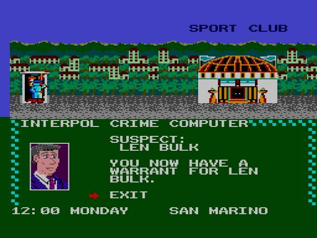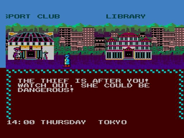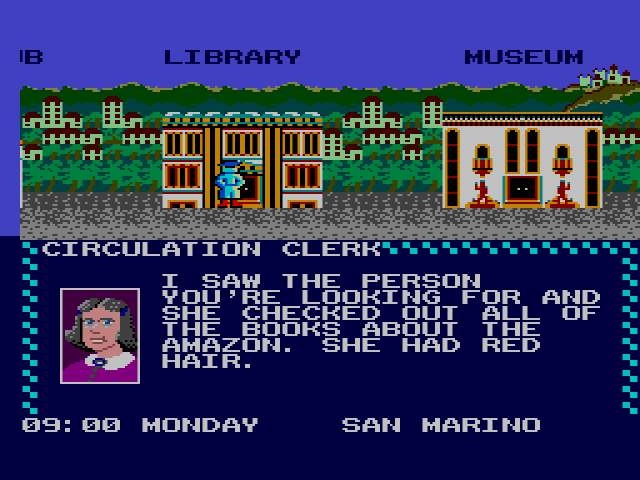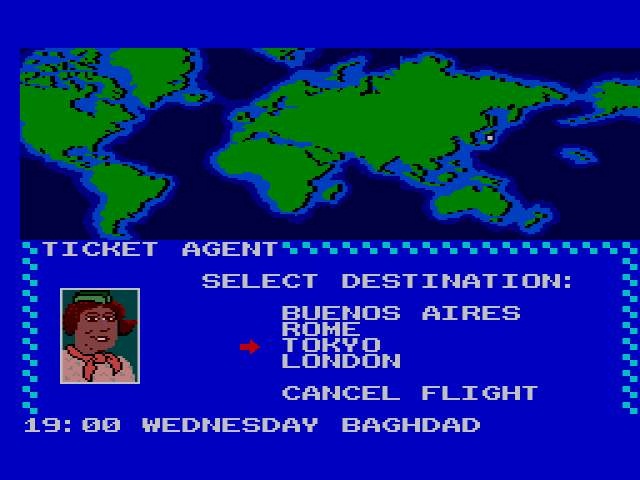 Juste au passage, le machin bleu ciel, c'est votre personnage. Oui, c'est pas terrible. En fait les graphismes sont assez moyens. Bon en même temps, on est en 1988. Le but du jeu n'est pas de travailler vos réflexes (quoique ), mais de vous faire travailler votre géographie. En effet, il vous faudra deviner la destination avec les indices, et donc avoir connaissances des pays. Par exemple si Carmen est partie avec un un drapeau rouge et blanc, et si elle a changé son argent en yens, sa prochaine destination sera le Japon.