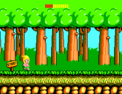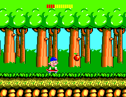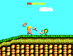 Avant de devenir une série à succès et de prendre d’autres directions beaucoup plus axées aventure, Wonder Boy a apporté un vrai enthousiasme au genre encore naissant de la plate-forme. C’est un des piliers en la matière sur SMS…et ailleurs, en raison d’une curieuse répartition des droits du soft : SEGA était propriétaire du nom, du cara-design et des musiques; de son côté, Escape avait les routines de prog et le level-design. Résultat: le titre s’est retrouvé édité par Hudson sur les consoles concurrentes sous le nom « Adventure Island » moyennant une licence et quelques modifications d’ordre cosmétique.