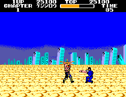 A la vue de la violence crue de Ken le Survivant, comme on l’appelle chez nous, SEGA a logiquement choisi de produire un jeu de baston. Pas mal inspiré d’une référence de l’époque, SpartanX / Kung-Fu Master, il s’agit d’un beat’em all franchement réussi qui retranscrit bien l’univers post apocalyptique de la série. Le niveau technique est en plus vraiment relevé avec, choses rares pour l’époque, des scrollings différentiels et de gros sprites lors des confrontations avec les boss. On note qu’à cette occasion, le combat se fait dans une aire fermée, en un contre un et avec une barre de vie pour chaque personnage. Ce n’était vraiment pas courant à l’époque, une sorte de Street Fighter avant l’heure !