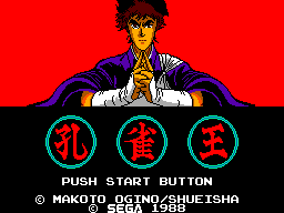 Kujaku Ou est mis sur le marché à l’automne 88, il reprend une série de mangas et un OAV faisant la part belle à la chasse aux démons dans une contexte occulte et mystique. Le programme est une combinaison de scènes d’action est d’aventure légèrement soupoudrées de RPG. Les phases de jeu sont bien indépendantes les unes des autres, dans des décors de japon féodal non dénués de charme. Il est de plus intéressant de gérer et d’utiliser plusieurs sorts au cours de votre quête. Un effort notable a été fait pour exploiter les possibilités de la Master System, la réalisation est solide, avec des graphismes léchés et une animation soignée, surtout lors de certains affrontements avec les boss. On sent que SEGA n’a pas voulu produire un jeu anecdotique. C’est tout à fait réussi, seuls quelques défauts empêchent le soft d’être un incontournable de la machine. Certains passages manquent de dynamisme, l’ensemble du jeu est assez linéaire malgré l’alternance action/aventure et ne propose pas vraiment de surprises. Enfin, la durée de vie est un peu juste.