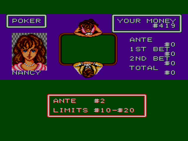 Enfin le poker se fera contre un unique adversaire que vous choisirez parmi 4. Ne vous laissez pas avoir par les jolis yeux de Nancy, c'est une pro. On voit ici que les graphismes sont assez sympas mais la bande-son se révèle assez inintéressante.