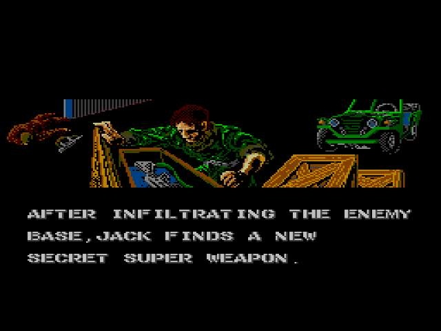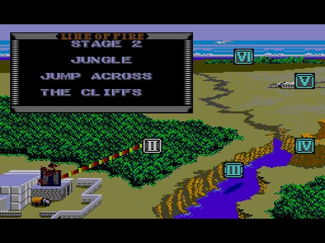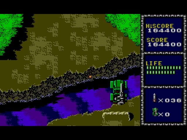 J'ai lancé le jeu avec la manette au hasard, pensant que le pistolet était nécessaire. Tiens, non : on dirige une jeep. Machinalement, je commence à mitrailler au bout 1 et tire des missiles. WTF ? Ok, les tirs simples sont avec le bouton 2. Je constate au passage que les missiles zigzaguent et ne touchent aucun ennemi : ça m'a l'air très utile...