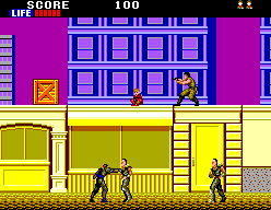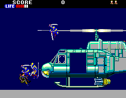 Tout d’abord, même si le programme suit fidèlement le déroulement du jeu original, quelques menues modifications ont été apportées. La plus notable concerne l’ajout d’une barre de vie au héros qui ne meurt plus au moindre contact d’ennemi ou de projectile. Le facteur stress s’en trouve allégé mais l’aventure conserve grosso modo le même niveau de difficulté. Les niveaux et les boss se reconnaissent aisément, dans une ambiance très japonaise qui a la bonne idée de combiner tradition (surikens, samurai, Mont Fuji) et modernité (décors urbains, armes à feu, hélico). La magie ninja a bien entendu été conservée, mais autre petite différence, pour pouvoir l’utiliser, il faudra d'abord la gagner dans les bonus stages en « vue subjective », bien convertis soit dit en passant. Vous ne débutez donc pas chaque vie avec un « jocker » en poche d’office.