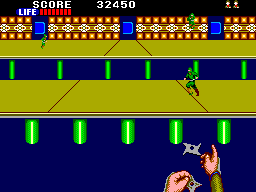 Un jeu génial en arcade devenu un classique sur SMS ne peut constituer une déception. Mais alors pourquoi la question énoncée plus haut, sous forme de réserve ? Tout simplement parce que les années affûtent notre sens critique : cette adaptation aurait pu et du être meilleure ! Trop d’éléments laissent penser que SEGA a voulu sortir rapidement le jeu sur sa 8-bit, dont la fin de carrière approchait à grands pas au Japon. Les graphismes sont bons mais en dessous des productions comparables de la même époque (cf. Kenseiden par exemple). On peut regretter des sprites à la taille un peu juste et relativement rigides, à l’image des contrôles d’ailleurs. Les séquences de magie, pourtant « marque de fabrique » pour Shinobi, perdent au change quand on fait là encore quelques comparaisons (cf. Golden Axe). Beaucoup plus regrettable par contre, alors qu’en arcade l’ambiance sonore était riche, quasiment la même musique tourne désespérément en boucle tout au long du jeu. Enfin, on touche à l’inacceptable quand on réalise qu’aucune fin, même sous la forme de deux lignes de texte, n’a été prévue. Après avoir sué sang et eau pour vaincre le dernier boss, vous serez gratifiés par le lapidaire et indigne « Game Over ». L’un dans l’autre, SEGA s’est contenté d’assurer, sans plus, ne serait-ce que dans le choix de la taille mémoire de la cartouche : 2 petits mégas (soit 256 Ko) quand un After Burner, pour le coup vraiment raté, en affiche 4.