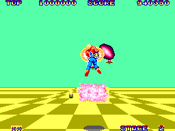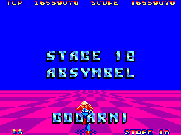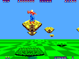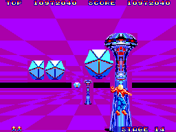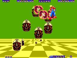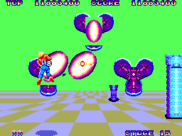 Voilà la conversion d’un shoot légendaire sorti fin 85 en arcade où il avait fait l’effet d’une véritable bombe. La qualité de son affichage pseudo 3D était tout bonnement stupéfiante pour l’époque. L’originalité de son univers psychédélique un brin kitch, associée aux sensations procurées, a fait de ce jeu l’un des piliers fondateur du « mythe SEGA » en arcade. Pour ce qui est de l’histoire en revanche, aucune révolution : vous incarnez un héros volant vu de dos, porteur d’une sorte de canon laser, partant nettoyer son petit monde de toutes les créatures l’ayant annexé.