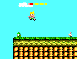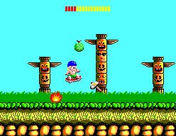 Avant de devenir une série à succès et de prendre d’autres directions beaucoup plus axées aventure, Wonder Boy a apporté un vrai enthousiasme au genre encore naissant de la plate-forme. C’est un des piliers en la matière sur SMS…et ailleurs, en raison d’une curieuse répartition des droits du soft : SEGA était propriétaire du nom, du cara-design et des musiques; de son côté, Escape avait les routines de prog et le level-design. Résultat: le titre s’est retrouvé édité par Hudson sur les consoles concurrentes sous le nom « Adventure Island » moyennant une licence et quelques modifications d’ordre cosmétique.