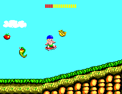 La marque de fabrique du jeu, ceux sont les fruits et objets en tout genre qu’il faut saisir continuellement pour maintenir sa vitalité qui fond comme neige au soleil sans apport de nourriture. Ceux qui veulent jouer au score pourront récupérer pas mal de goodies dont des poupées qui vous ouvriront les portes d’un ultime monde caché à la fin du jeu. Le skateboard, plus rapide et assez poilant, offre surtout un petit joker en cas de contact avec un ennemi.